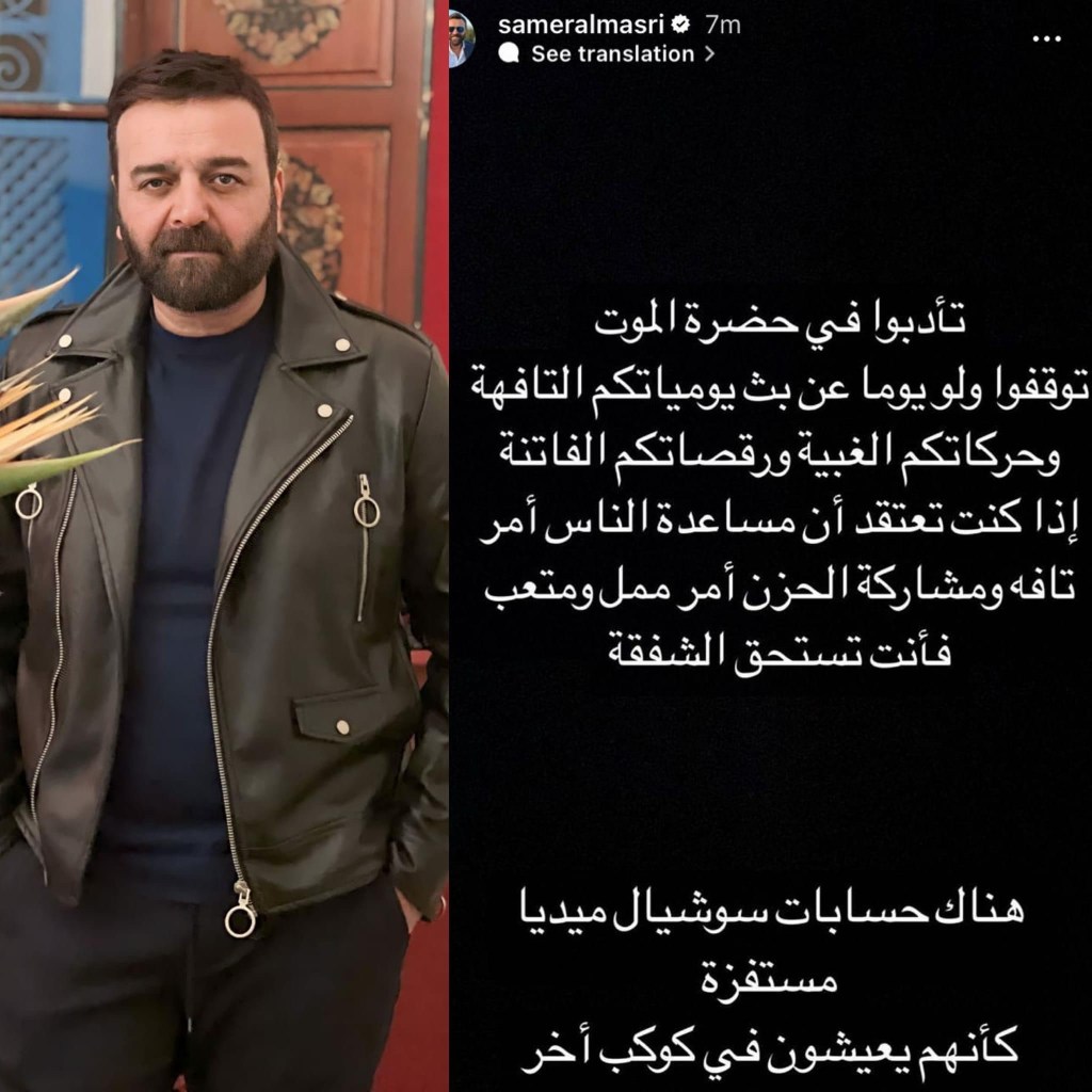 اعرب الفنان السوري سامر المصري عبر حساباته على السوشيل ميديا غضبه من بعض رواد مواقع التواصل الاجتماعي حيث كتب الفنان الأشخاص الذين يشاركون يومياتهم وكأن شيئاً لم يكن ” هناك حسابات سوشيال ميديا مستفزة كأنهم يعيشون في كوكب أخر