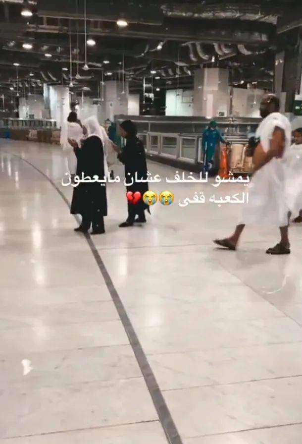 ويظهر في المقطع “سيدتان يمسكان بيد بعضهما ويخرجن من صحن الكعبة وبيت الله الحرام وهم يعطيان وجوههما للكعبة بينما يسيران بالعكس ويصعدان السلم بظهرهن بينما يستمران في رفع أيديهن للدعاء”.