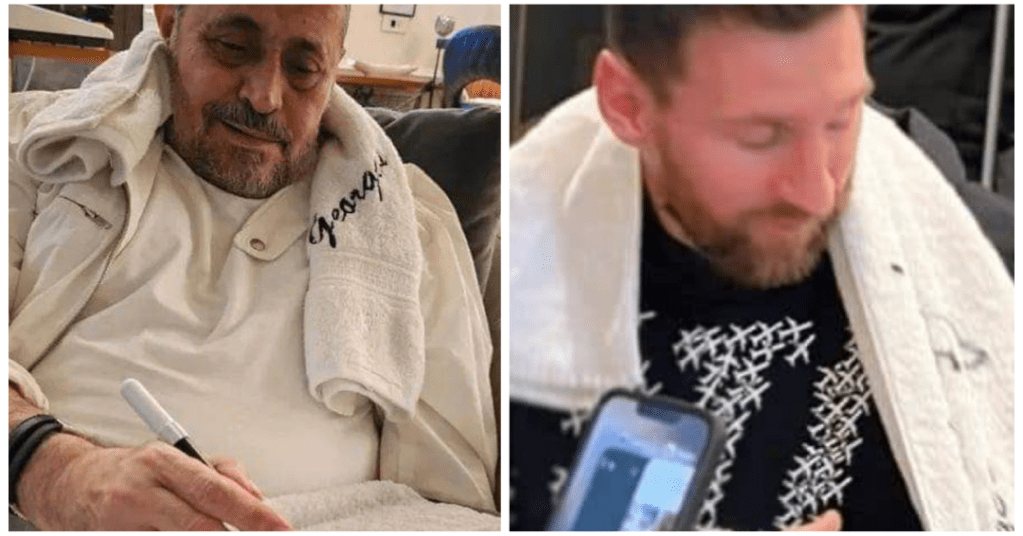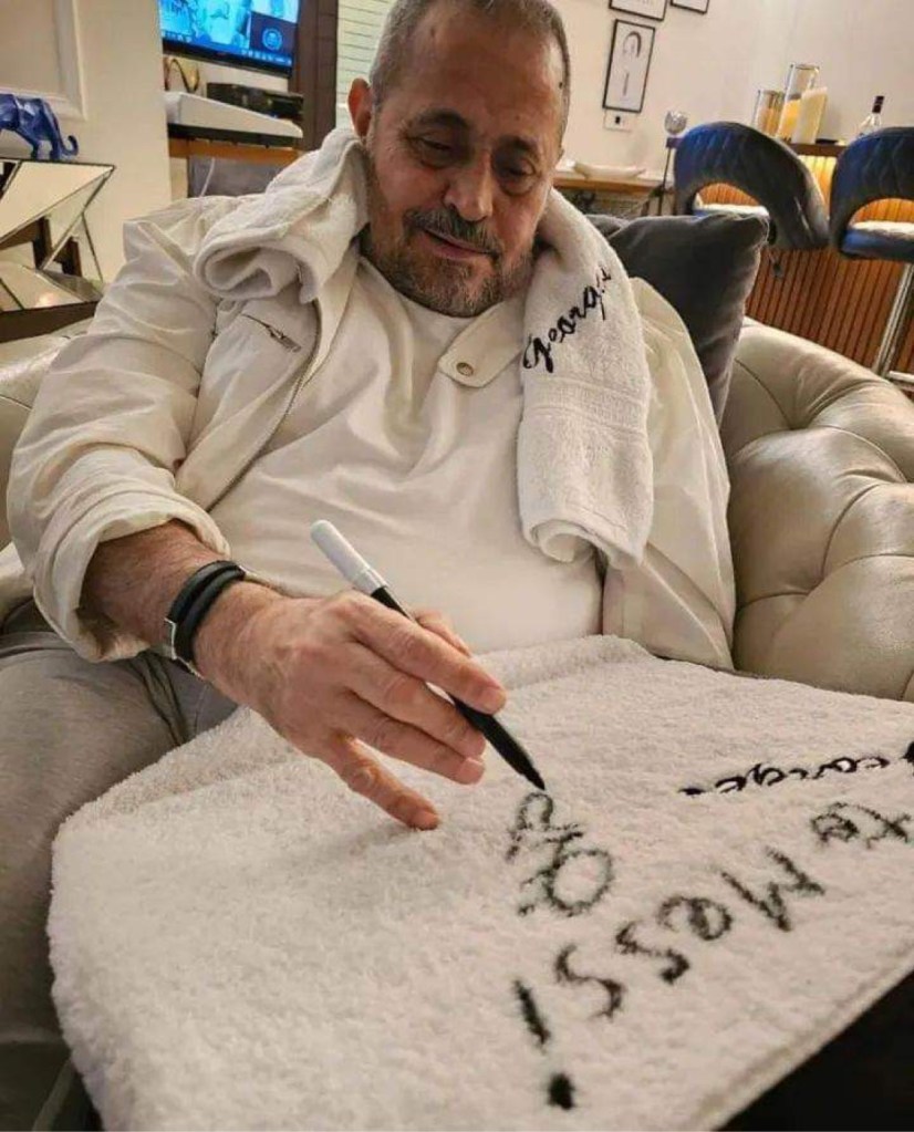 ونشر جورج وسوف صور لحظة استلام ميسي هديته “المنشفة” على حساباته الرسمية في تويتر وفيسبوك.