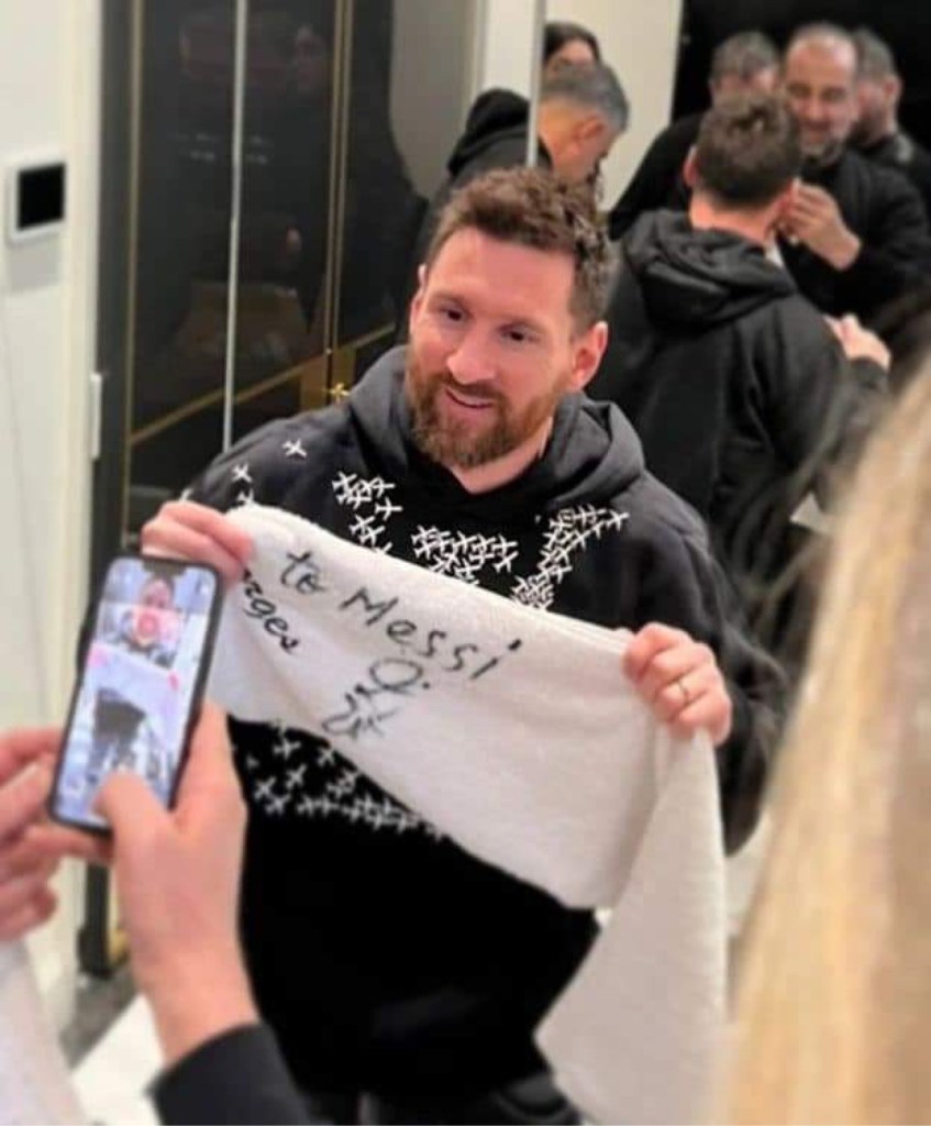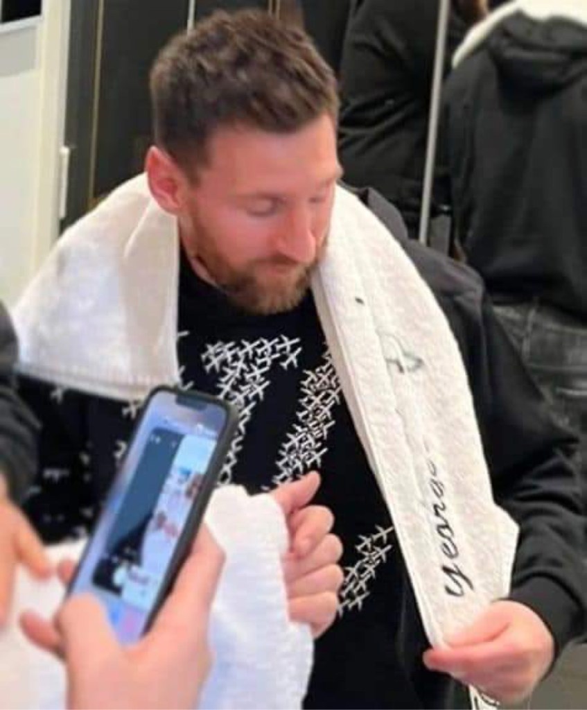 وكانت الهدية التي استلمها ميسي في النادي الباريسي عبارة عن “منشفة” موقع عليها باسم “ميسي”، وقد بدا الأخير سعيداً وهو يحمل المنشفة ويلتقط الصور .