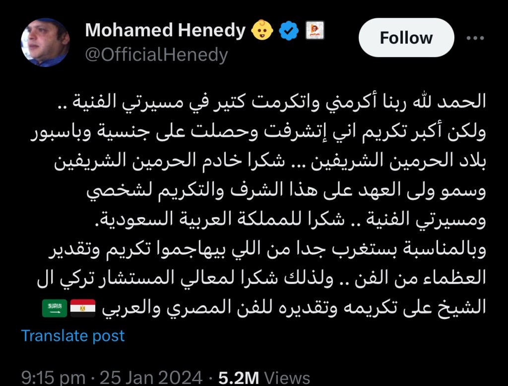حيث كتب هنيدي عبر حسابه على منصة «إكس»: «الحمد لله ربنا أكرمني واتكرمت كتير في مسيرتي الفنية، ولكن أكبر تكريم أني إتشرفت وحصلت على جنسية وباسبور بلاد الحرمين الشريفين. شكراً خادم الحرمين الشريفين وسمو ولى العهد على هذا الشرف والتكريم لشخصي ومسيرتي الفنية. شكراً للمملكة العربية السعودية