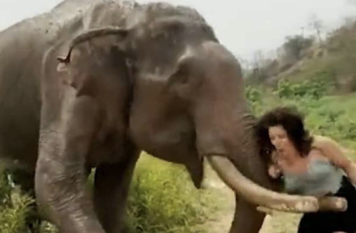فيل ينطح امرأة حسناء ويقذفها في الهواء