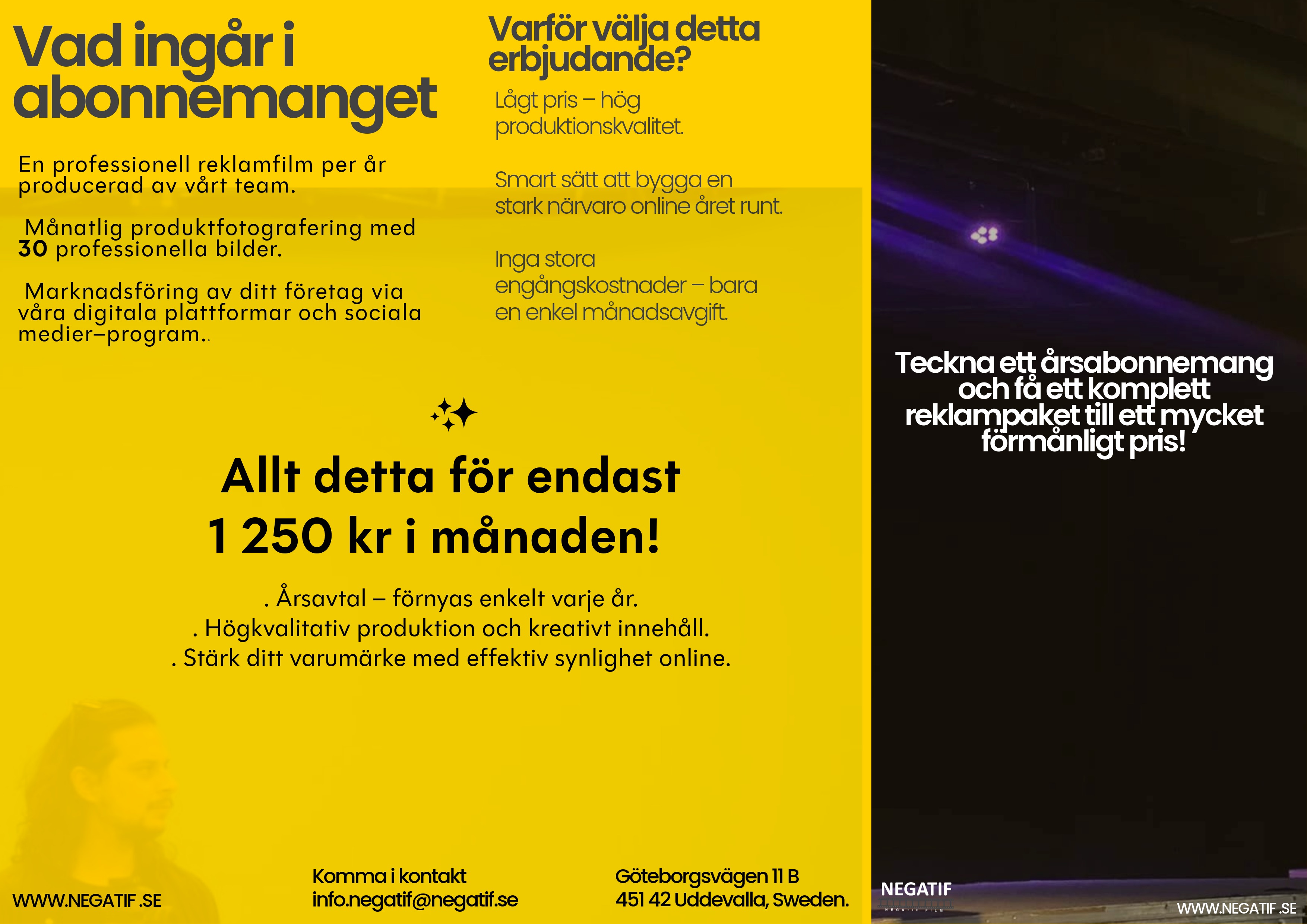 Vad ingår i abonnemanget Kontakt Göteborgsvägen 11 B 451 42 Uddevalla, Sweden.UDDEVALLA info.negatif@gmail.com +46723007055 Facebook Instagram Facebook Twitter WordPress Skicka meddelande till oss Go backYour message has been sent Namn Warning E-post Warning Website Warning Meddelande Warning Warning. Submit Δ Göteborgsvägen